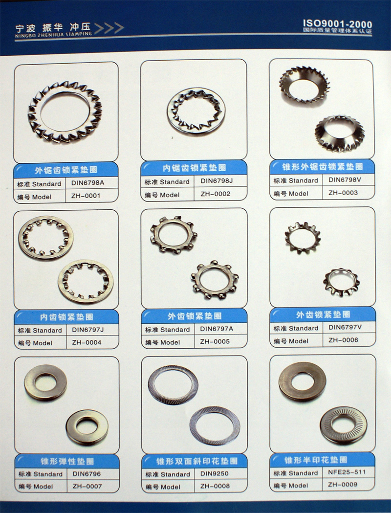 Founded in 1989, Ningbo Zhenhua stamping Co., Ltd. is a proffessional enterprise which specialized in producing cold stamping production. We offer national standard products DIN seriers, nonstandard products, and OEM service . We mainly engaged in manufacturing DIN6797, DIN6798, DIN137, DIN9250,DIN6796,DIN7967, DIN432,NFE25-511, cold stamping,stainless steel stamping,car assessories stamping, and rabidity mould stamping. Besides,we also can manufacture products to exat specifications of our clients optimized processos. Nowadays, There are more than 120 punch lathe, and 10 auto punch equipment line , 3 shear trigger machine, and 2 generator groups in our company. we have more than 100 employees, and among 11 of them with years experience of practice and theory in producing and repairing mould of cold stamping. More than 75% of our products are exported to Europe, America, Asia, Where they are being in coroporated into the manufacture of automobiles, trucks, trailers, and so on. Furthermore, we are supplying our high quality products to BEAR Group in China, VOLKSWAGEN Inc of Germany, General Motor Coroporation(GM) of USA, and Philips Inc of Holland. Over the years, our business developed rapidly and we have obtained the international quality system certification ISO9001. Based on carrying out this system,We supply high quality products and quality services with competitive price. Welcome clients at home and abroad visit us and give your precious advice. If you are intrested in any kind of our products, please do not hesitate to contact us for more information.